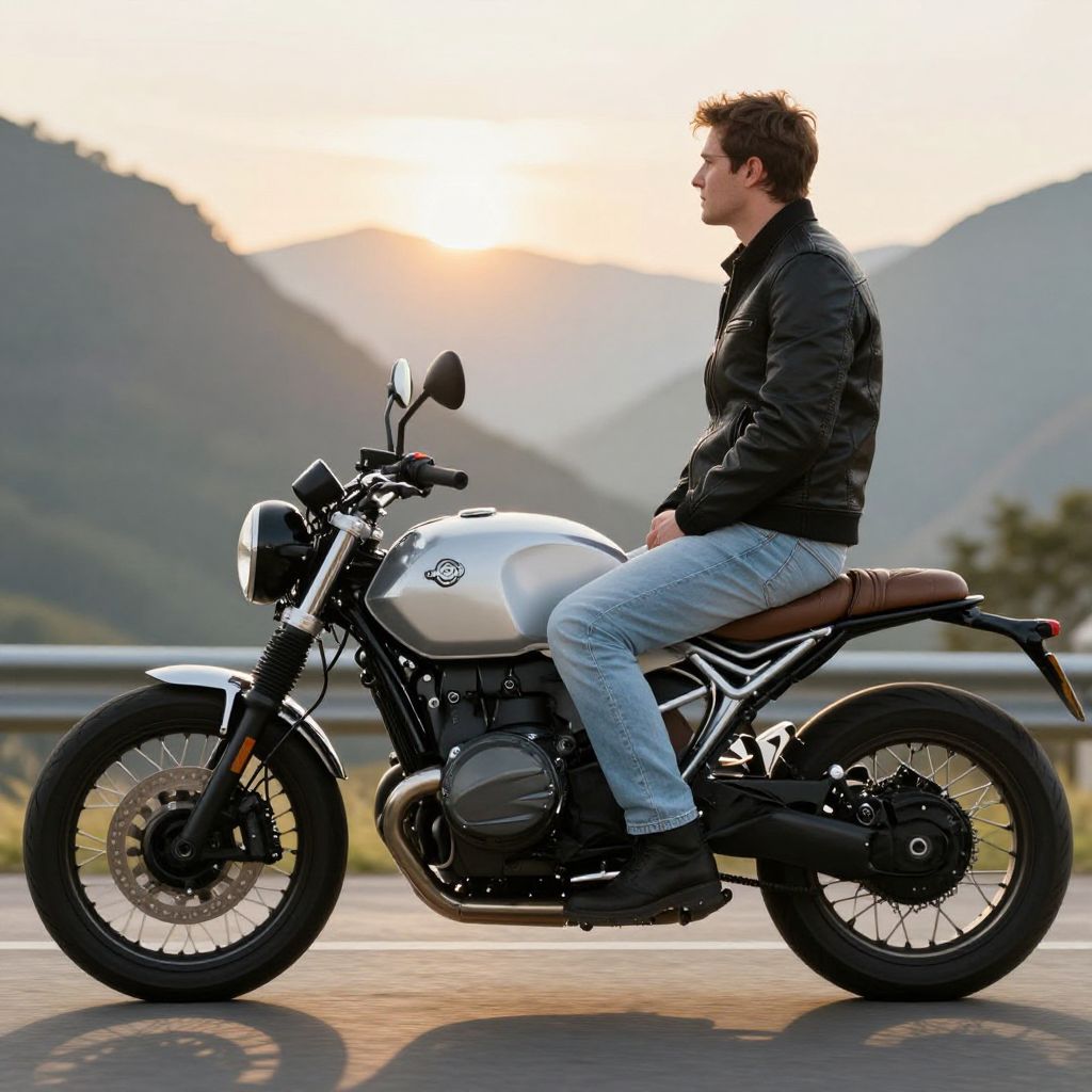 Straight Ahead Animation Man sitting on a BMW R-NineT Scrambler in a mountanous setting looking at the sun with cafe racer style clothes, light jeans and black leather modern jacket,