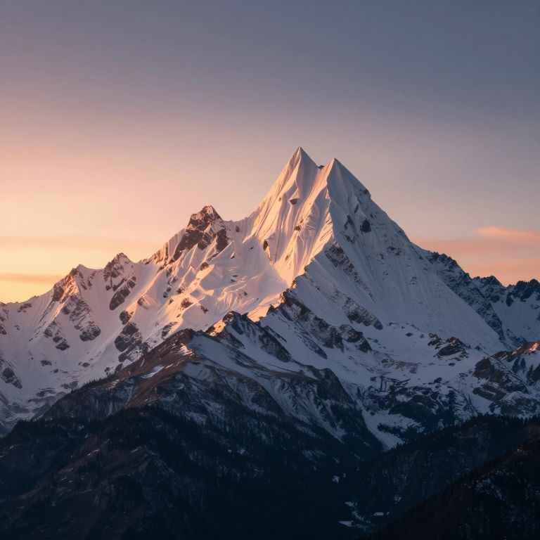 Photograph of a majestic snow-capped mountain peak at sunset. The peak, bathed in warm golden light, stands prominently in the center, with rugged, dark rocky slopes extending outward. The sky transitions from a soft orange near the horizon to a deep blue at the top. Snow blankets the higher elevations, contrasting with the dark, shadowed lower slopes. The mountain's texture is sharp and jagged, with visible ridges and crevices. The overall scene evokes a sense of tranquility and awe, highlighting the natural beauty and grandeur of the mountain landscape.