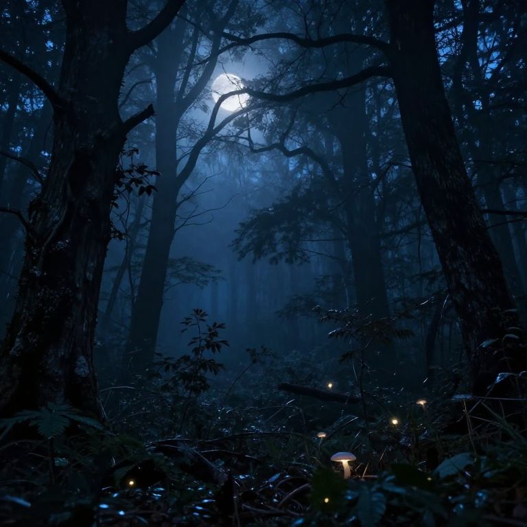 Dark forest with moon hanging low, illuminating gnarled tree branches, dense undergrowth, deep blue and black hues, mystical fog weaving between trunks, subtle glowing mushrooms scattered, a sense of quiet magic and hidden secrets.
