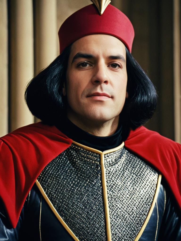 Man in Lord Farquaad costume, cinematic realism, sharp portrait detail