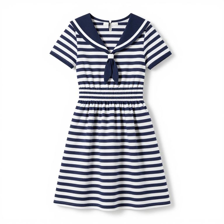 Photograph of a short-sleeved, navy and white striped dress with a sailor collar and tie, laid flat against a white background.