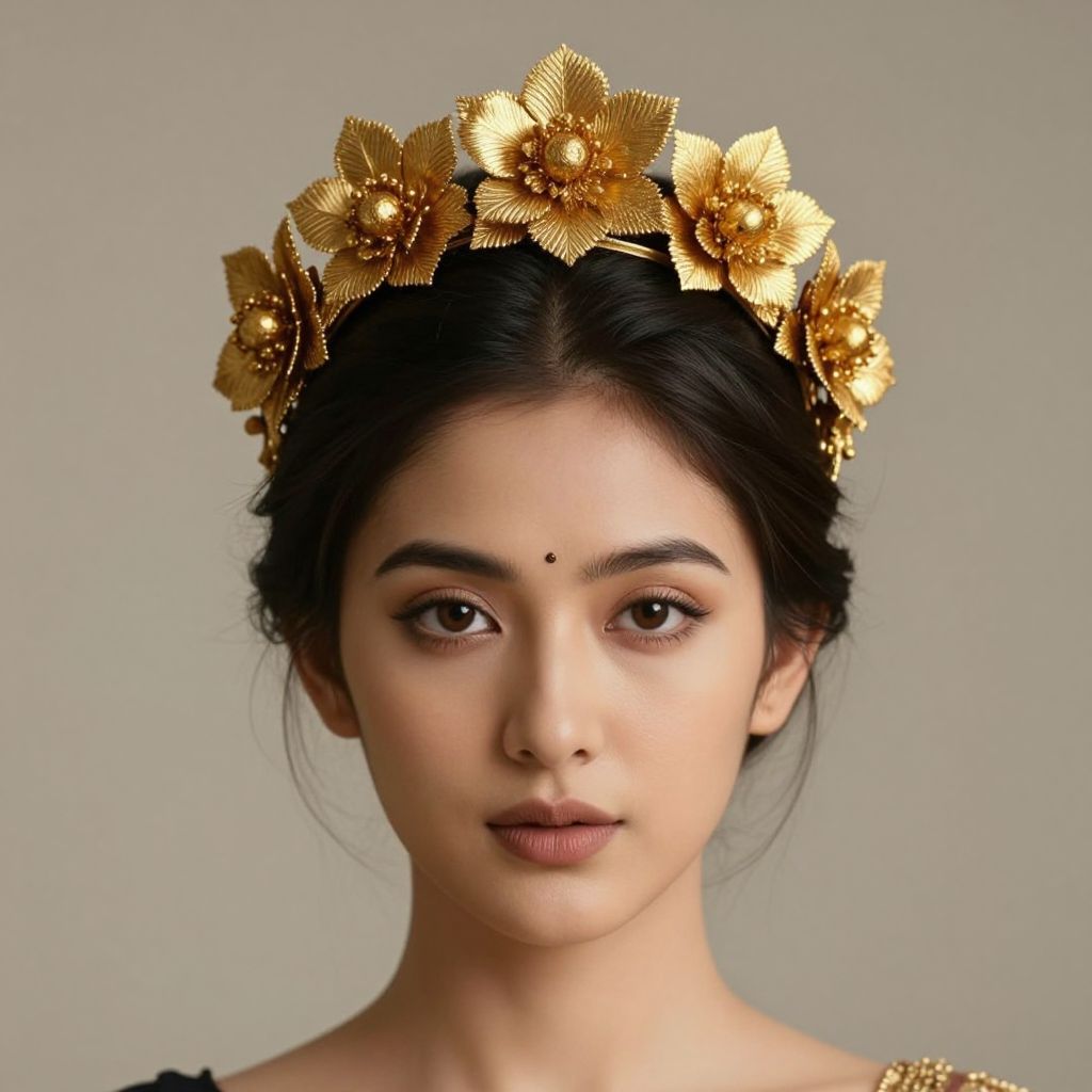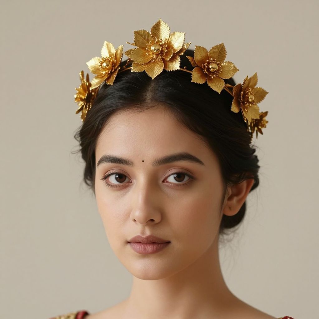 Woman wearing a delicate gold flower crown adorned with seven intricately designed golden blooms and leaves, complemented by a subtle bindi on her forehead, exuding elegance against a soft, neutral background.