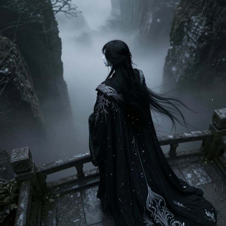 A digital artwork depicting a mysterious, dark-robed figure with long, flowing black hair standing on a misty, ancient wooden bridge between two towering, rocky cliffs. The figure's back is to the viewer, revealing intricate white patterns on the robe's edges. The scene is shrouded in a bluish, ethereal mist, with snowflakes gently falling. The bridge's wooden planks and stone balusters are worn and weathered, adding to the eerie, mystical atmosphere. The overall color palette is dominated by dark blues and blacks, enhancing the mysterious and somber mood of the image.