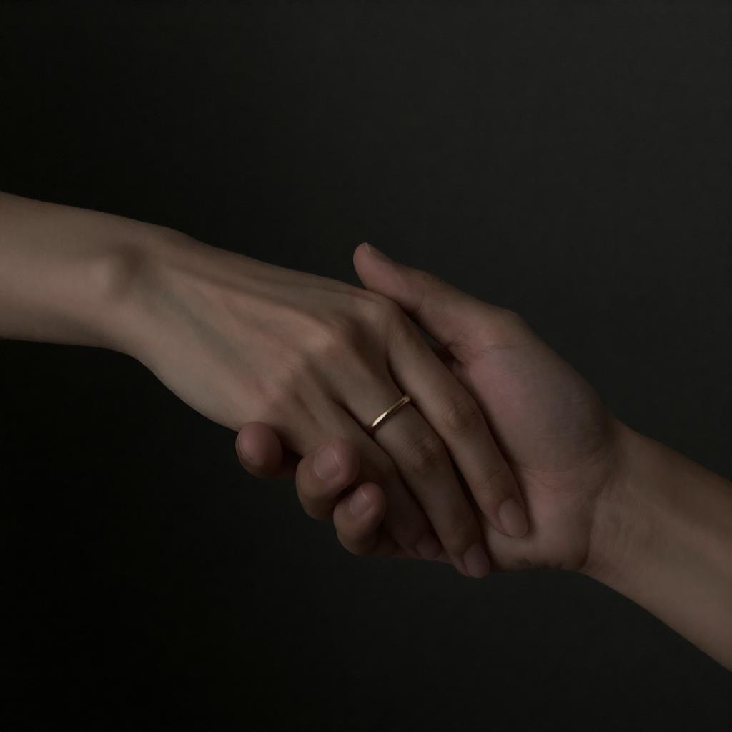 Photograph of two hands in dim light, one with a gold ring, gently holding the other's hand. The hands are positioned horizontally, with fingers slightly intertwined. The background is dark, emphasizing the intimate connection between the hands.