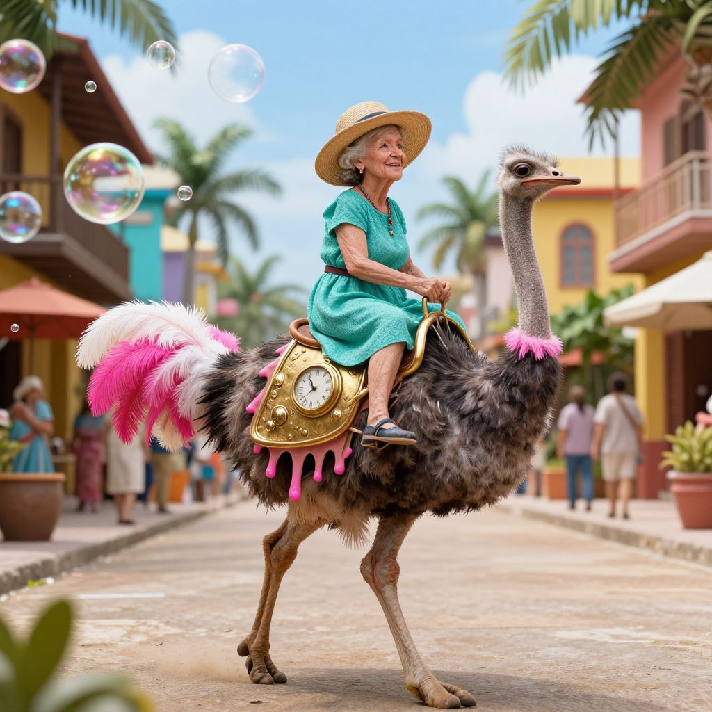 A whimsical elderly woman in a sunhat and teal dress rides a majestic ostrich adorned with a golden clockwork saddle and vibrant, melting pink-and-white feather plumage, traversing a bustling tropical street lined with colorful buildings and floating soap bubbles.