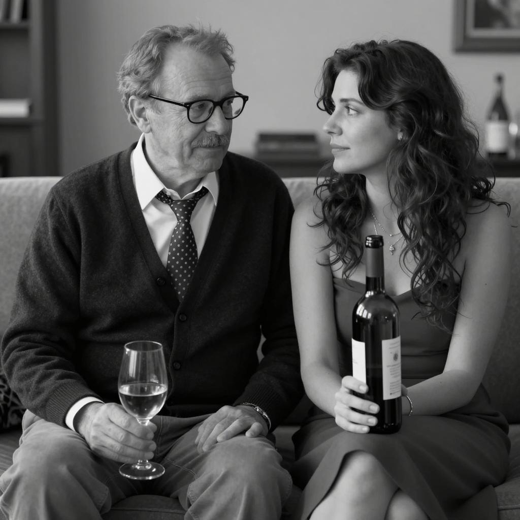 Man with glasses, balding, brown suit, white shirt, black tie, holding glass, looking at woman. Woman with red hair, red dress with low neckline, holding wine bottle, serious expression. Background with blurred windows and furniture. Both seated. Man on left, woman on right.