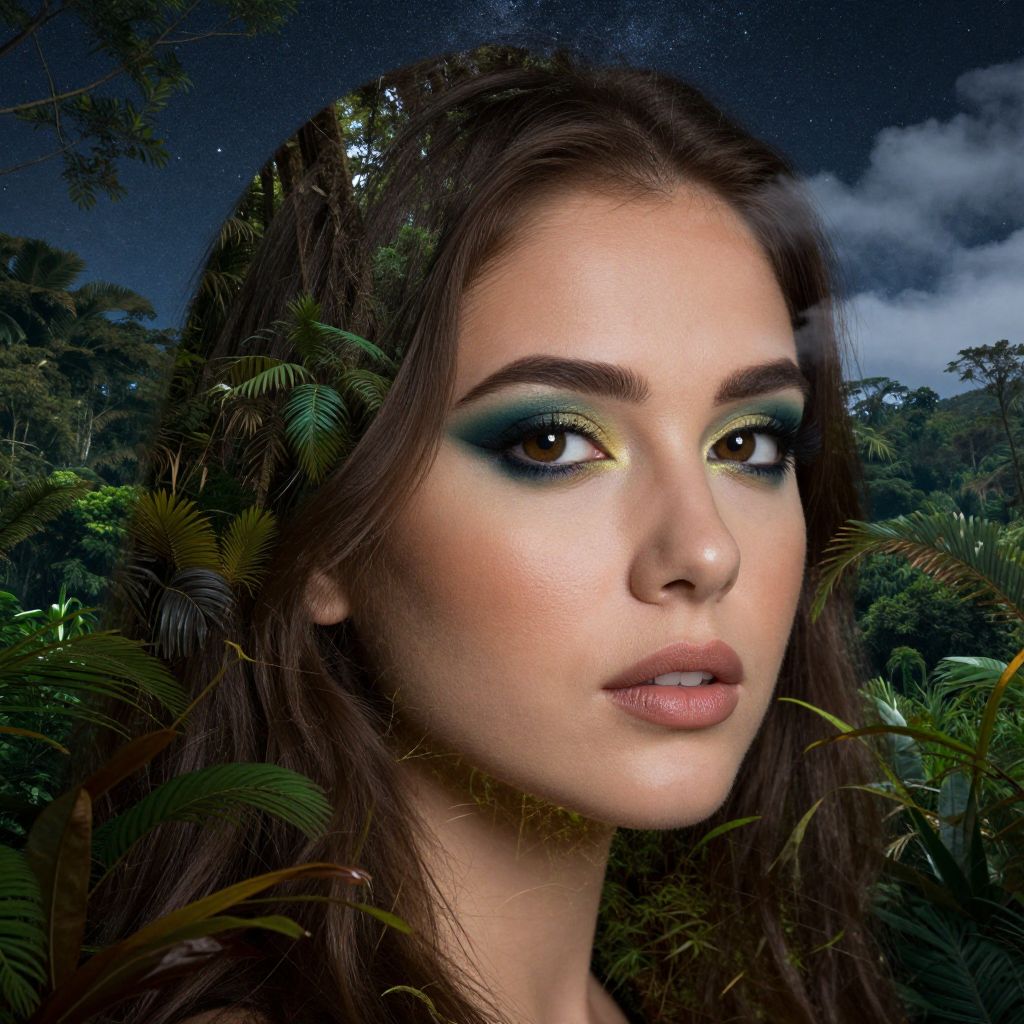 The image presents a stunning triple exposure of a woman's face, seamlessly blended with a lush jungle and a starry night sky. The woman's face, with its detailed features and vibrant makeup, occupies the central portion of the image. To the left and right of her face, the dense foliage of a jungle stretches out, with various shades of green and brown leaves creating a rich, textured background. The jungle extends into the night sky, where stars and clouds are visible, adding a celestial element to the composition. The overall image is high resolution, with intricate details visible throughout, from the woman's hair and makeup to the intricate patterns of the jungle and the starry sky. The spatial relationships are harmonious, with the woman's face acting as the focal point, surrounded by the natural beauty of the jungle and the serene night sky. The interplay of colors, textures, and shapes creates a visually captivating and emotionally evocative scene.