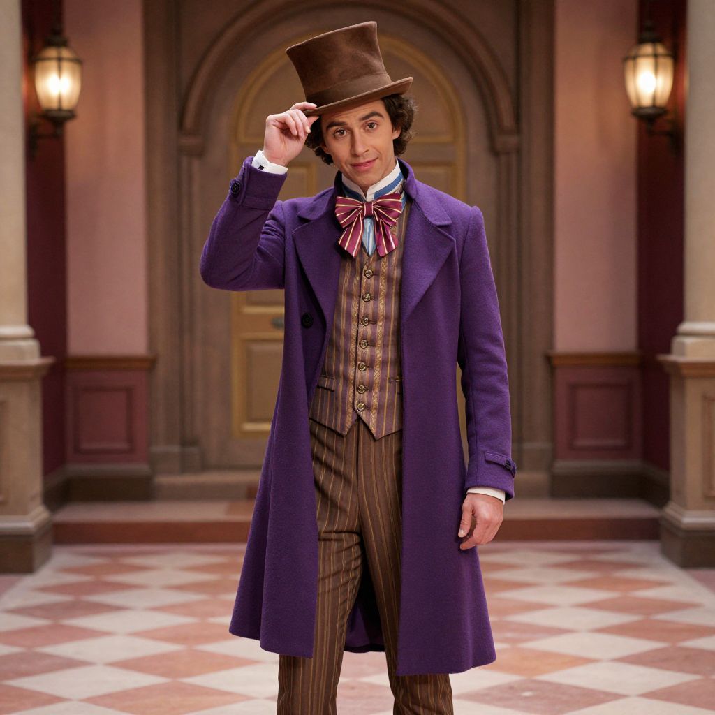 Willy Wonka Dressadult Avatar Costume, dressed in a purple coat and hat standing in a hall