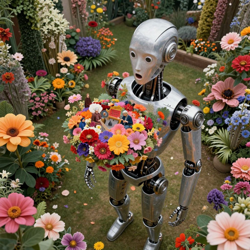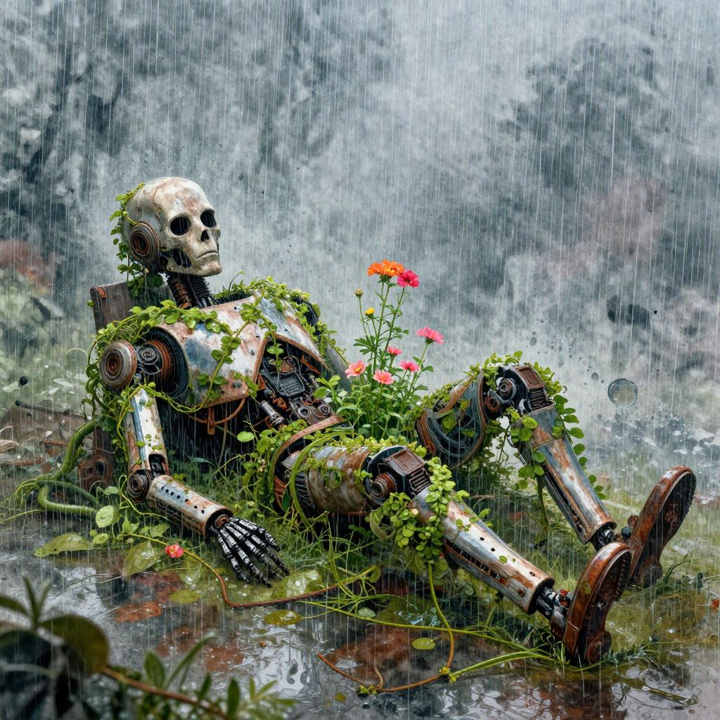 A digital painting depicts a weathered, humanoid robot seated in a rainforest-like setting. The robot is adorned with vibrant red and yellow flowers, with green vines wrapping around its metal limbs and torso. Rain pours down, creating a misty, blurred background of gray and blue hues. The robot's metallic parts are rusted, and its skeletal face shows a hollow, lifeless expression. It sits in a shallow, reflective puddle, surrounded by lush, green foliage. The overall scene combines a sense of decay and rebirth, with the mechanical nature of the robot contrasting with the natural growth of the plants.