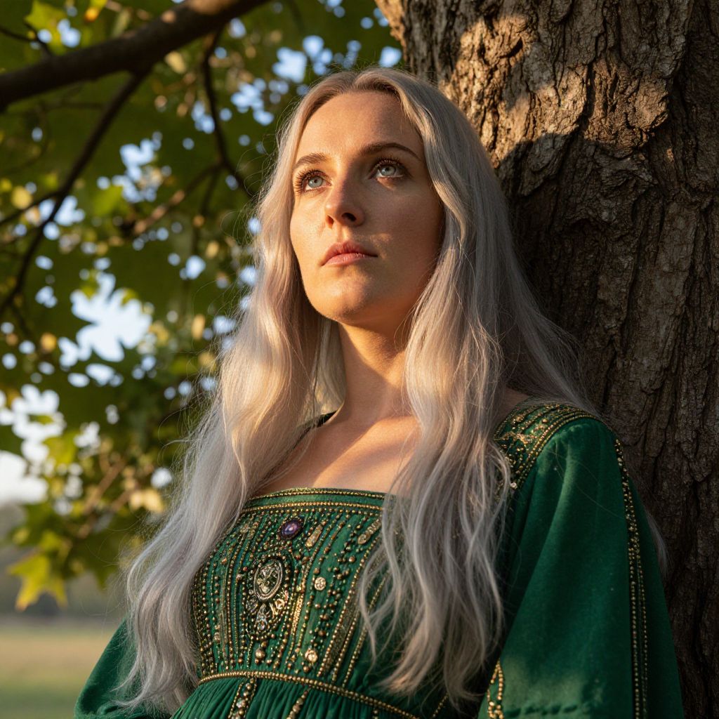 Imagine a photorealistic portrait captured by a mirrorless camera, showcasing an enigmatic European woman with piercing blue eyes and long, silver hair cascading over her shoulders. Illuminated by the golden afternoon sunlight filtering through ancient tree leaves, she leans against weathered bark in an emerald dress adorned with intricate beadwork. From a unique low-angle perspective, marvel at the interplay of light and shadow across her robust features, evoking both serenity and introspection. This ethereal scene blends timeless Renaissance beauty with hyper-realistic modern digital art, leaving viewers curious and captivated.