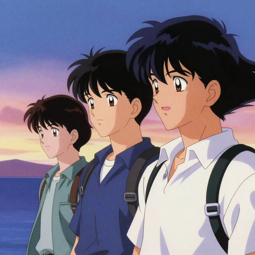 90s anime men by the seaside at sunset, soft pastel colors mixed with bold black outlines, expressive eyes and hair blowing in the wind, iconic 90s anime art style