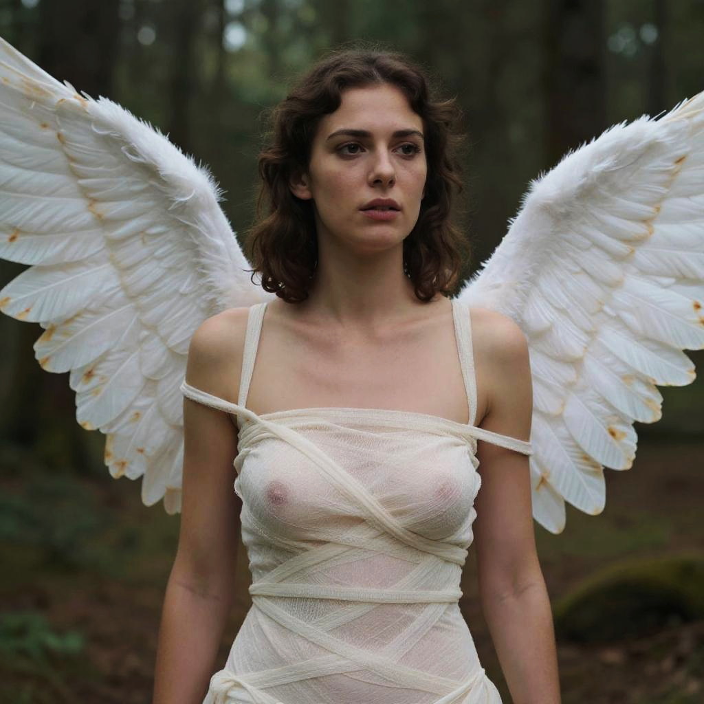 A woman, (wearing off_shoulder_bandage_dress, has_wings, dragon_wings:1.2), black dress, big wings, good hand, 4k, high-res, masterpiece, best quality, head:1.3, ((Hasselblad photography)), finely detailed skin, sharp focus, (cinematic lighting), soft lighting, dynamic angle, [:(detailed face:1.2):0.2], medium breasts, (((inside a forest)))