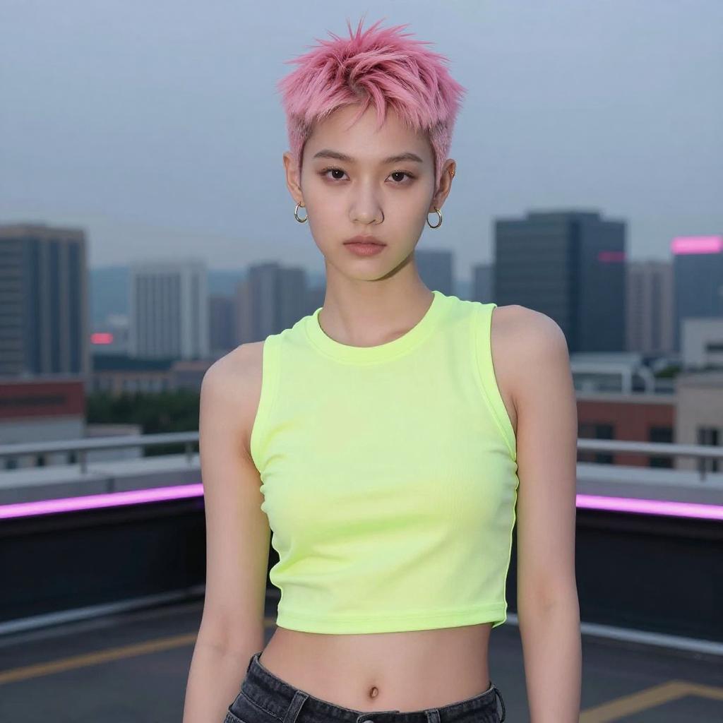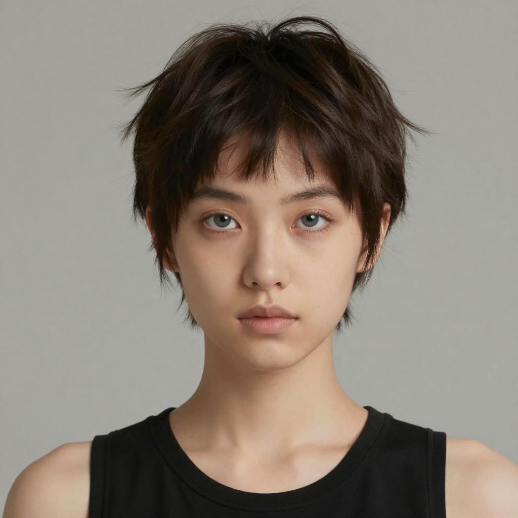 A pretty girl wearing a backpack crossing a busy tokyo road, inkpunk768, f/1.4, square image, close up film photo, portrait of a female, cyan pixie cut, light brown eyes, bone and jewel jewelry, elegant pose, atmospheric lighting, cinematic composition, detailed, winter, filmgenre__