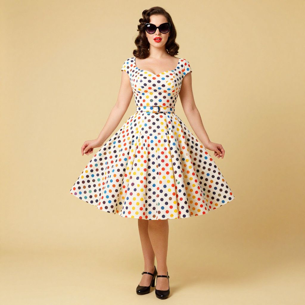 Full body shot, voluptuous woman, vintage-inspired retro swing dress, vibrant polka dots, fitted bodice, flared skirt, knee-length hem, soft cotton fabric, wide waistband, matching belt, cap sleeves, sweetheart neckline, playful petticoat, classic Mary Jane shoes, bold red lipstick, oversized sunglasses, playful hair curls, elegant yet fun, nostalgic charm Sexy. Pretty face and beаutiful eyes. Big breasts