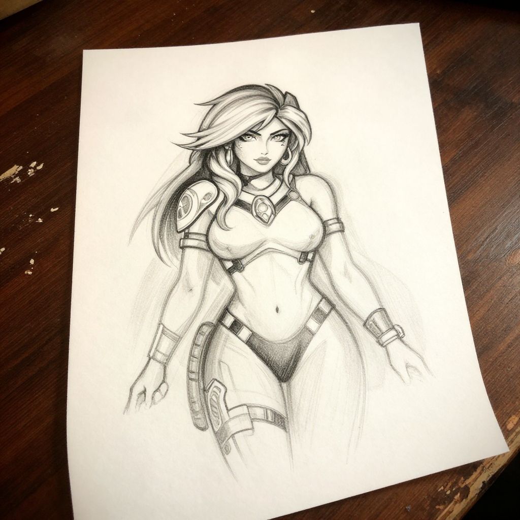 A black-and-white pencil drawing on white paper features a voluptuous, anime-style woman with long, flowing hair, large breasts, and a toned physique. She wears a revealing outfit with a high-neck top, arm bracers, and a belt with pouches. Her expression is confident, and she has a tattoo on her left shoulder. The background is a textured, dark wooden surface. The drawing is detailed with fine lines, emphasizing her curves and attire. The overall style is reminiscent of modern anime and manga art.