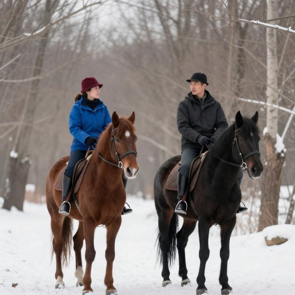 Photograph of a man and woman riding horses in a snowy, leafless forest. The woman, wearing a blue jacket and red hat, rides a brown horse, while the man, in a dark jacket and hat, rides a black horse. Both horses are saddled and the ground is covered in light snow.