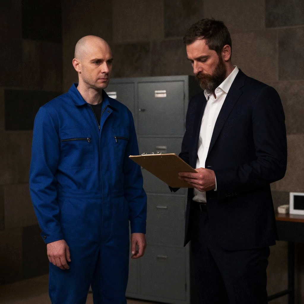 Photograph of two men in a dimly lit, stone-walled room. Bald man in blue jumpsuit stands with neutral expression. Bearded man in dark suit holds clipboard, stands opposite, looking down. Metal cabinet with drawers in background.