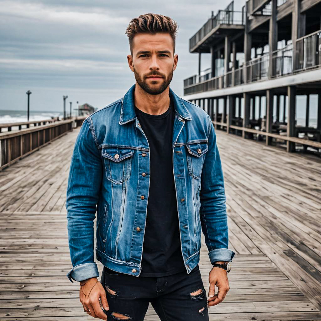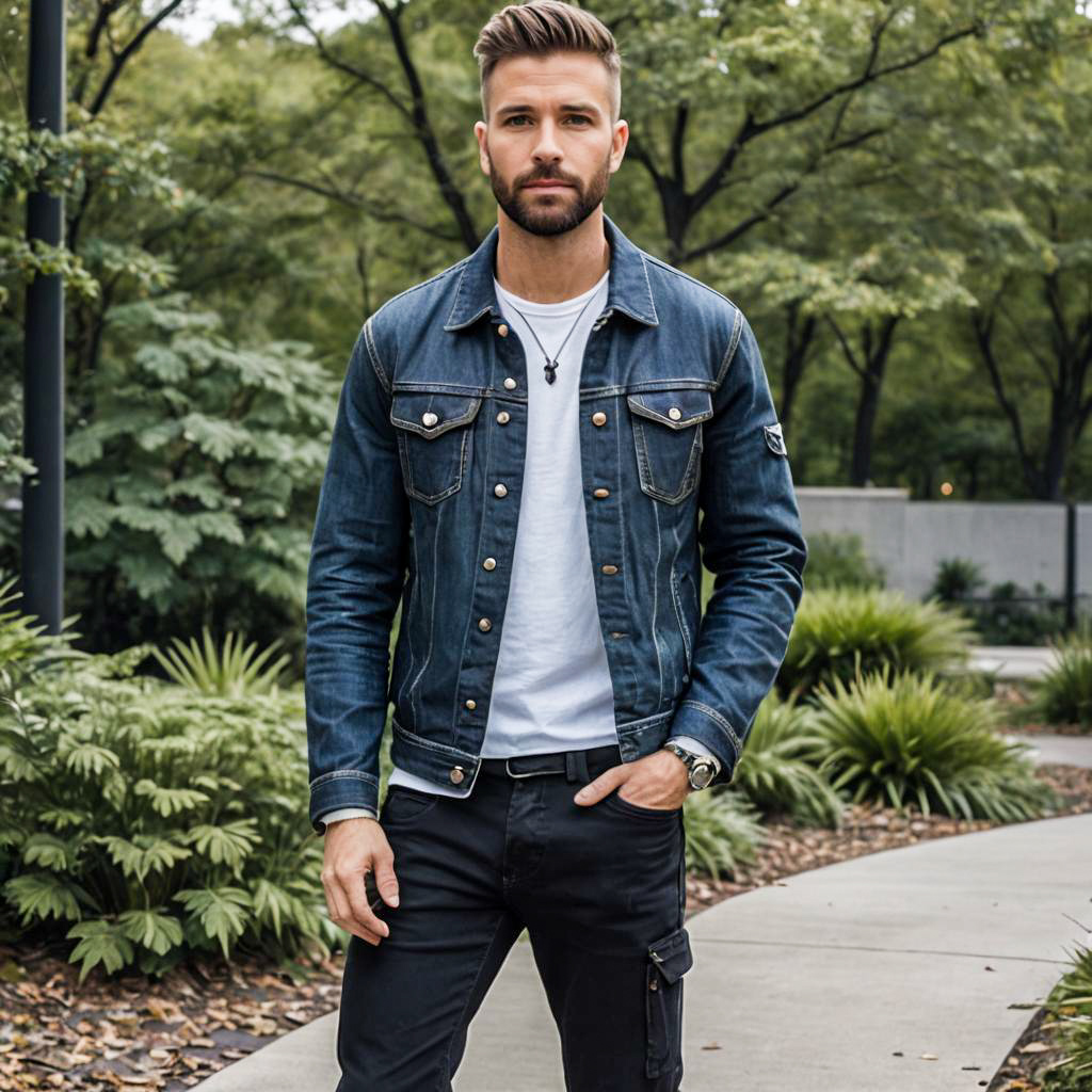 Photo of a Rugged Build man, Messy Hair, the outfit, casual modern style with a blue denim jacket, white Synthetic Fibers t-shirt, black ripped jeans, leather challenge boots in Steel Gray, minimalist accessories, urban style, Mountain trail, bold contrasts