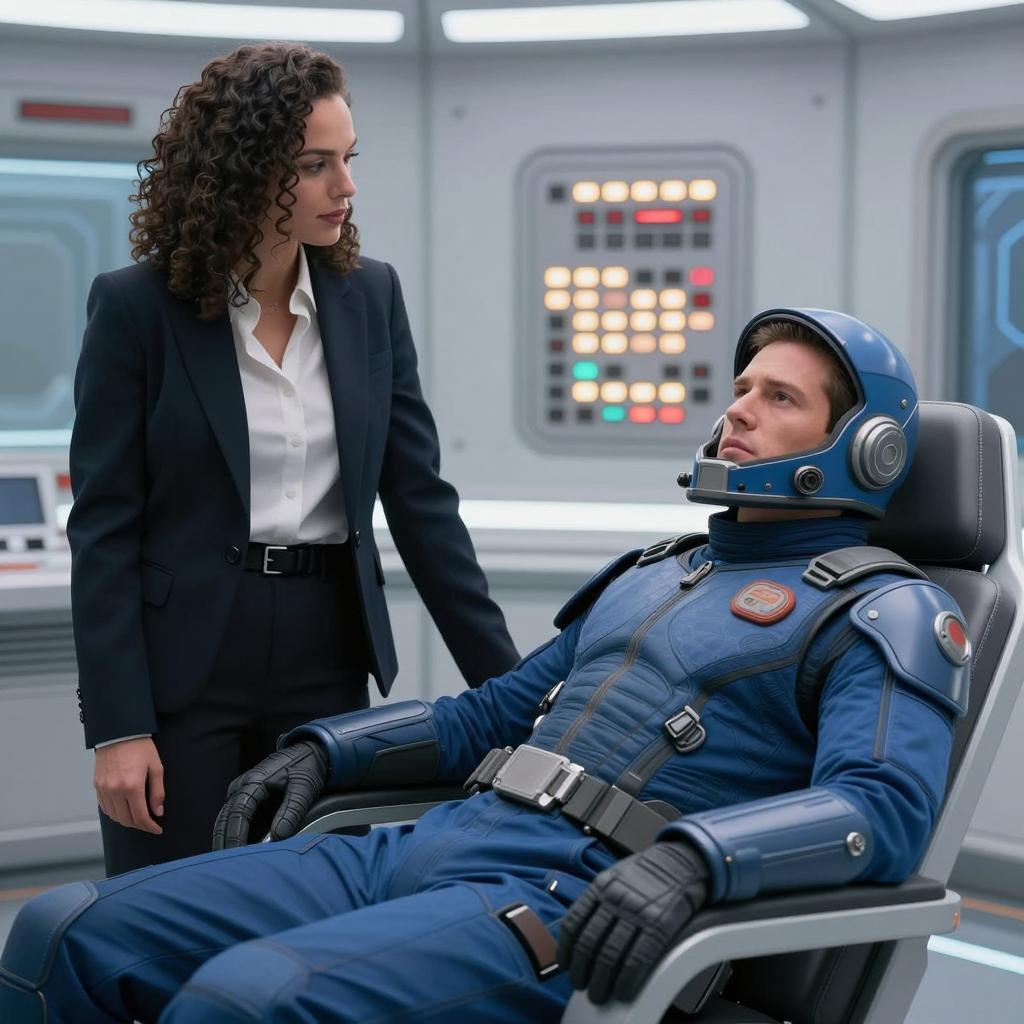 Futuristic Spacesuit in Abstract Control Room