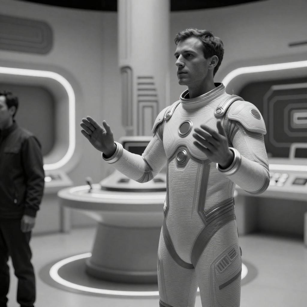 Black and white photograph of a man in a futuristic, form-fitting spacesuit with intricate patterns, standing in a highly stylized, abstract control room. Another figure in dark clothing is partially visible on the left. Man's head is turned slightly to the right, hands raised. Background features geometric shapes and complex patterns. Man's expression is neutral. Control room has curved, illuminated panels and a central, cylindrical object.