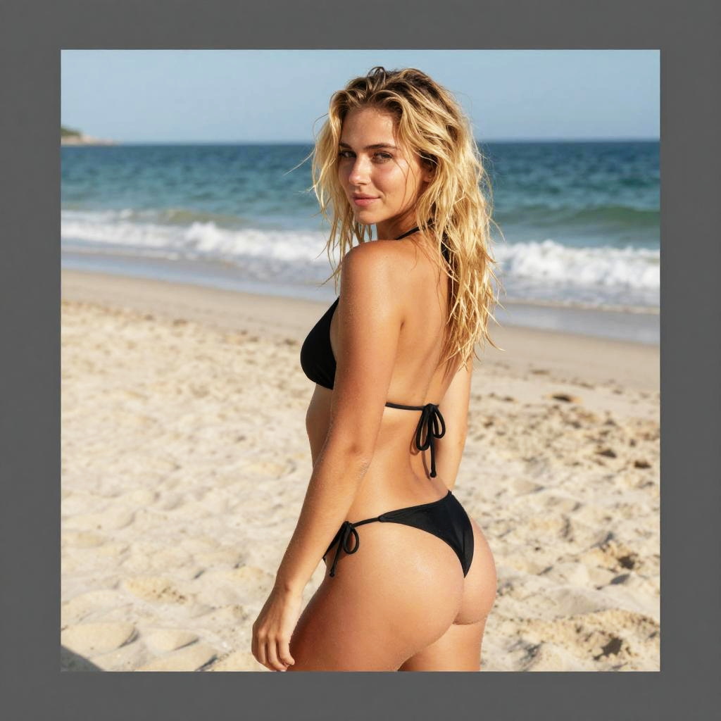 Photograph of a blonde woman with wavy hair, wearing a black string bikini, standing on a sandy beach with blue ocean waves in the background,