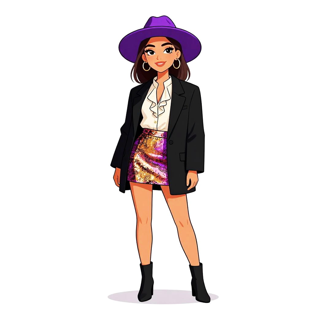 This is a digitally drawn, vibrant illustration of a stylish woman with a medium skin tone and dark brown hair. She wears a wide-brimmed purple hat, large hoop earrings, a white blouse with a bow at the collar, a black blazer, and a high-waisted, short, shimmering skirt with a colorful, glittery pattern. She also has black ankle boots. The background is plain white, making her outfit and accessories stand out prominently. Her confident pose and bright expression add to her fashionable, modern look.