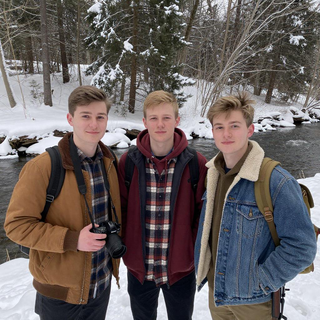 Photograph of three young men standing outdoors in a snowy forest. The man on the left has short brown hair, wears a tan jacket and plaid shirt, holding a camera. The man in the middle has short blonde hair, wears a red hoodie and plaid shirt, with a neutral expression. The man on the right has light brown hair, wears a denim jacket with a fur collar, and has a backpack with a rifle strapped to it. Snow-covered trees and a river in the background. All men are close together, smiling slightly.
