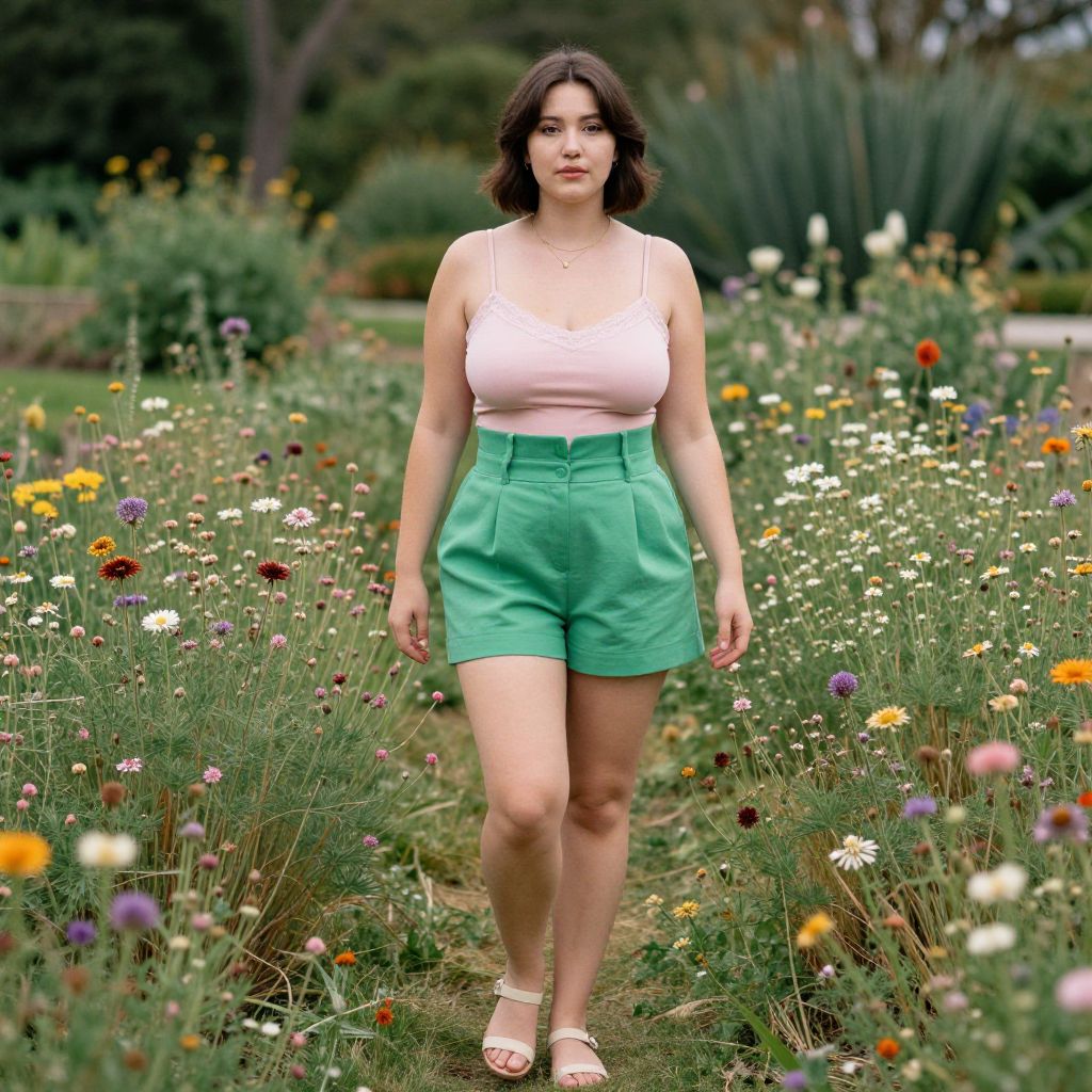 A curvy woman in a casual summer outfit, wearing a pale pink spaghetti strap top with lace trim and high-waisted bright green shorts, strolls through a floral meadow in a botanical garden. She pairs her look with cream-colored flat sandals and simple gold jewelry, her short hair framing her natural makeup. The scene captures her enjoying the vibrant surroundings, reminiscent of a Kodak SP analog photo. Sexy. Pretty face and beаutiful eyes. Big breasts