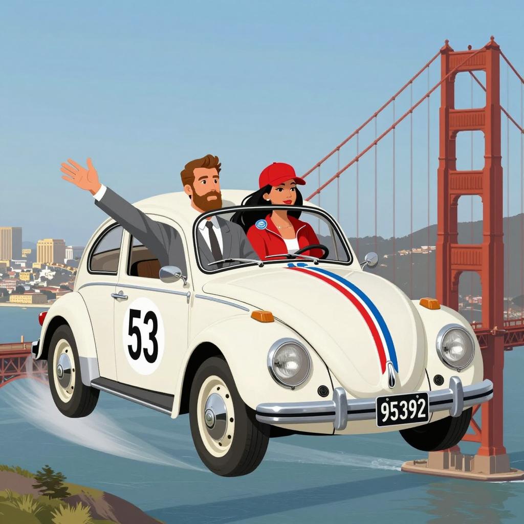 Illustration of a white vintage Volkswagen Beetle with blue and red racing stripes and numbers 53, hovering above the Golden Gate Bridge. Two people ride the car: a bearded man in a gray suit with arms outstretched, and a woman with dark hair wearing a red cap and red jacket, sitting in the passenger seat. The car has a black license plate with "95392." The background shows a blue sky, a cityscape with yellow buildings, and the bridge's red towers.