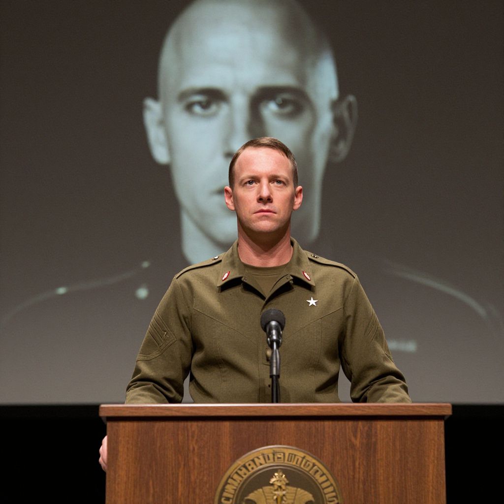 A man in a military uniform stands at a podium, with a projection of a bald man's face in the background, in a scene from the 1984 movie \"Command and Conquer\" directed by Michael Mann.