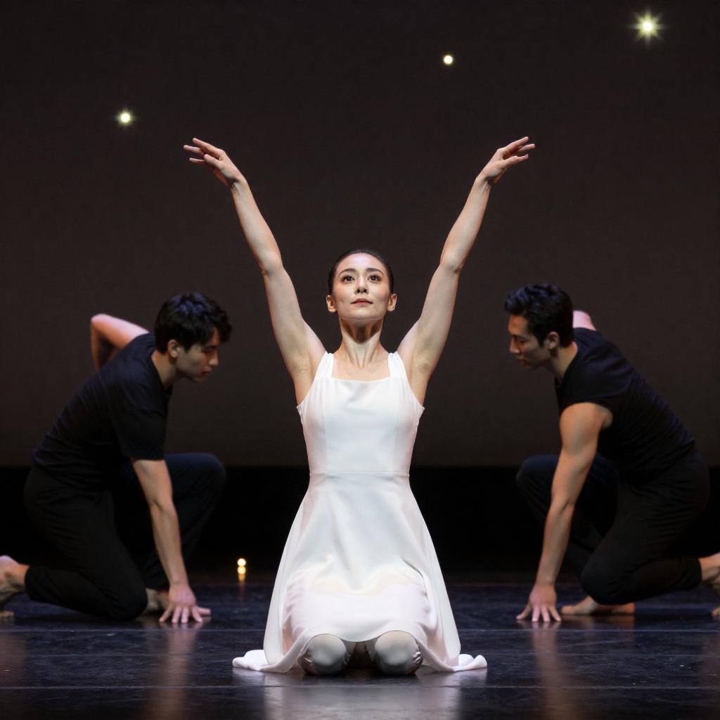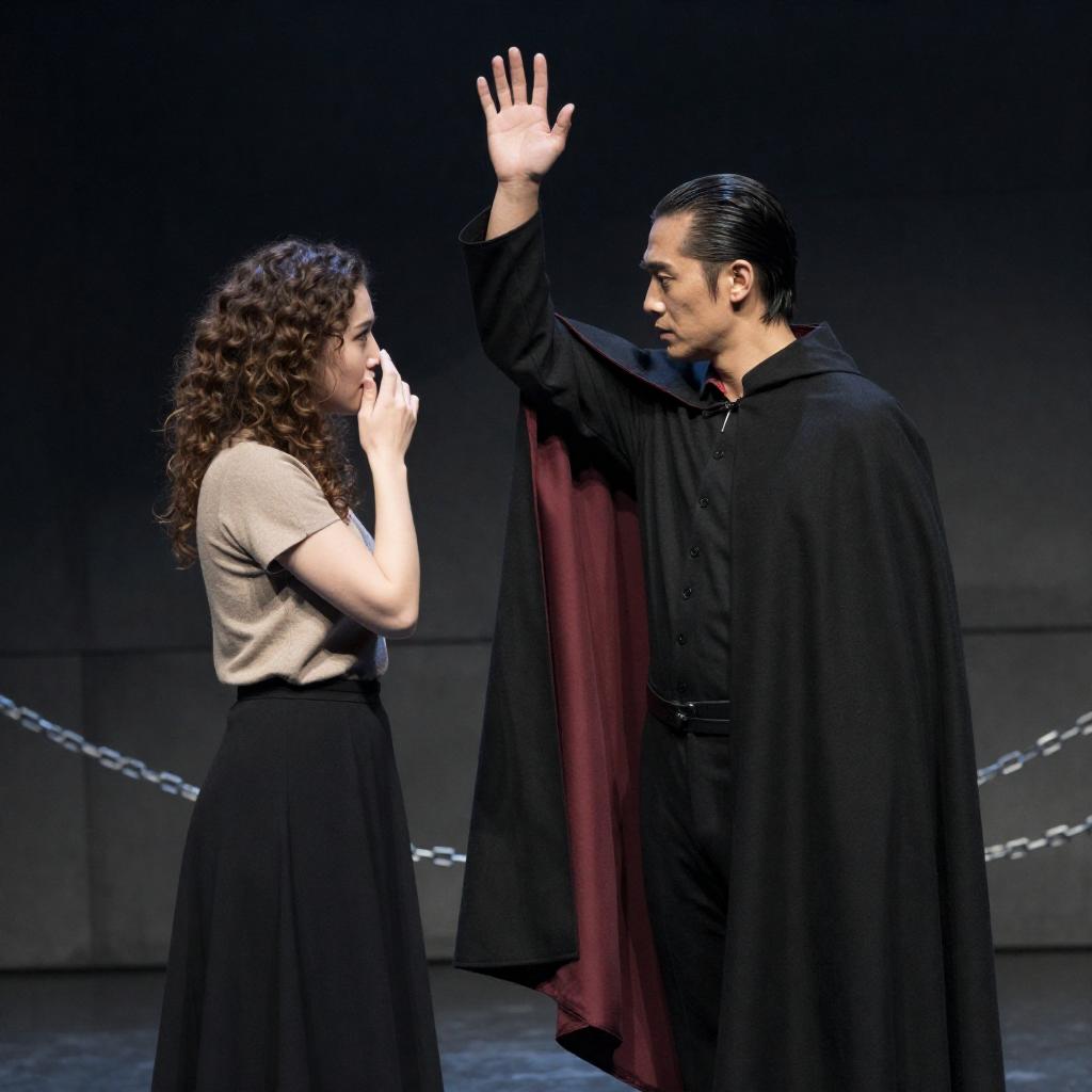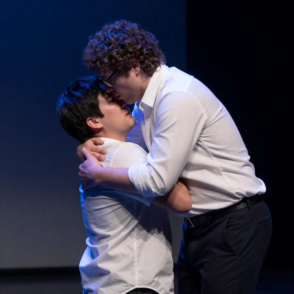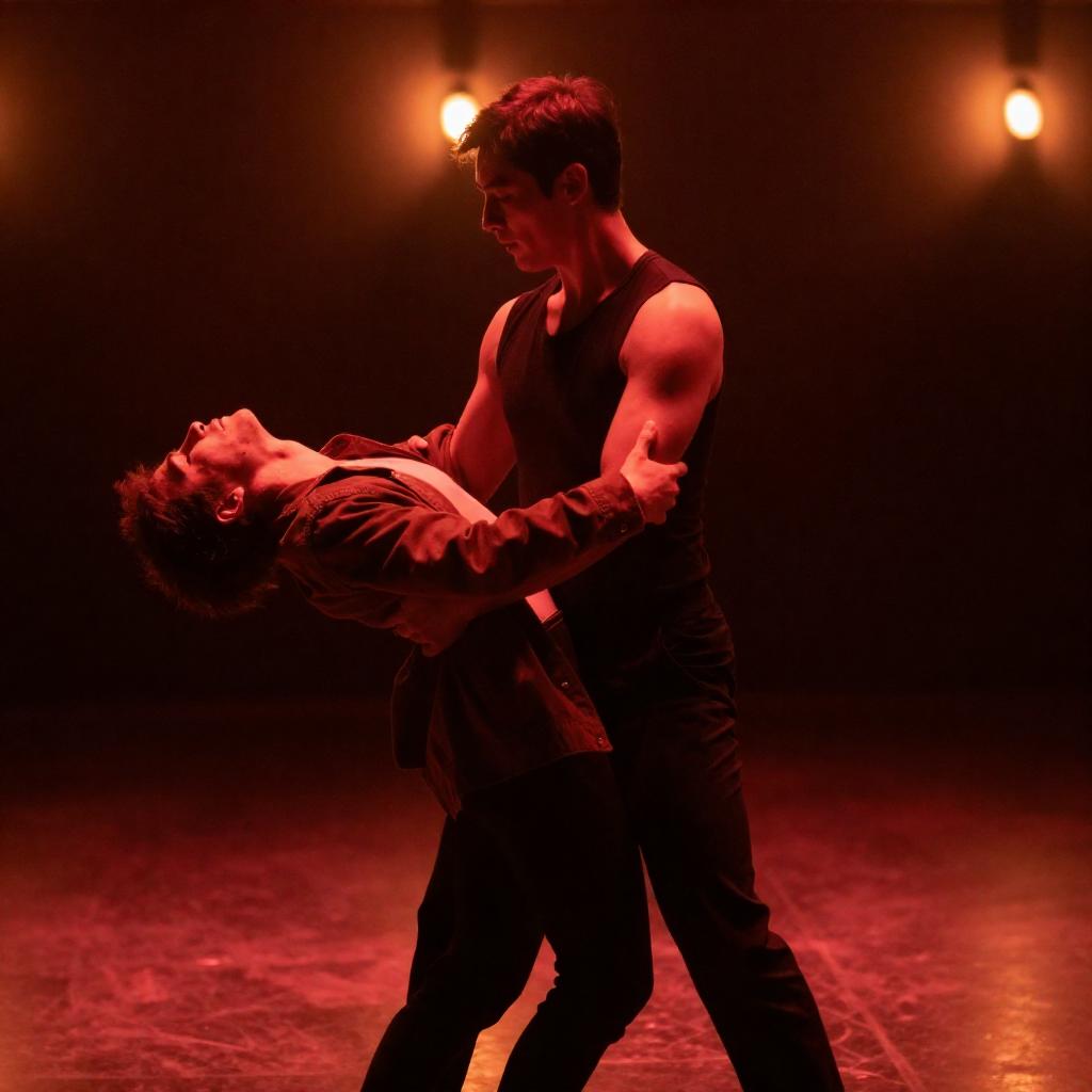 Photograph of a red-lit scene. Woman in white shirt stands, leaning forward, looking down at man lying on floor. Man is in black clothing, face down, arms outstretched. Dark background with wooden chair to left. Intense expressions. Two people.