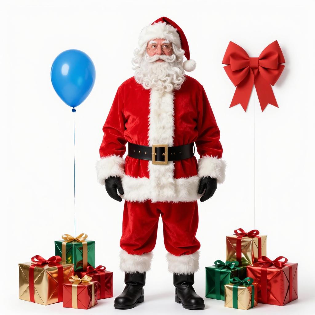 Adult santa elf costume, photograph of an elderly man dressed as a christmas elf, standing in front of a solid red background, wearing a red and green elf outfit with white fur trim, striped green and red stockings, brown boots, santa hat, white beard, hands behind back, christmas wreath with red and gold ornaments hanging to the right, full body, smiling, studio lighting, festive attire, christmas theme, bright colors