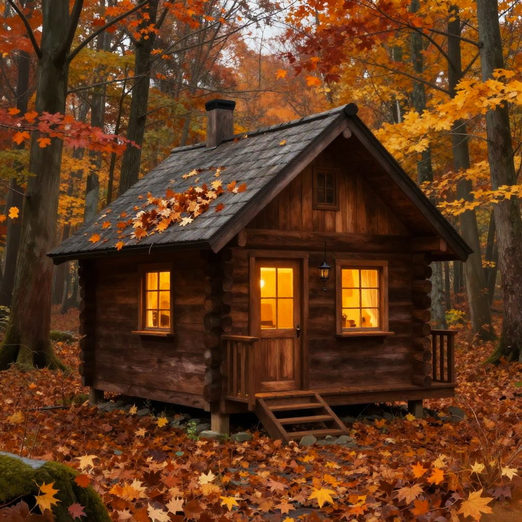 Ahorn-inspired wooden cabin nestled in a dense forest during fall, warm light glowing from windows, surrounded by piles of fallen colorful ahorn leaves, cozy and rustic atmosphere, realistic detailed digital painting.