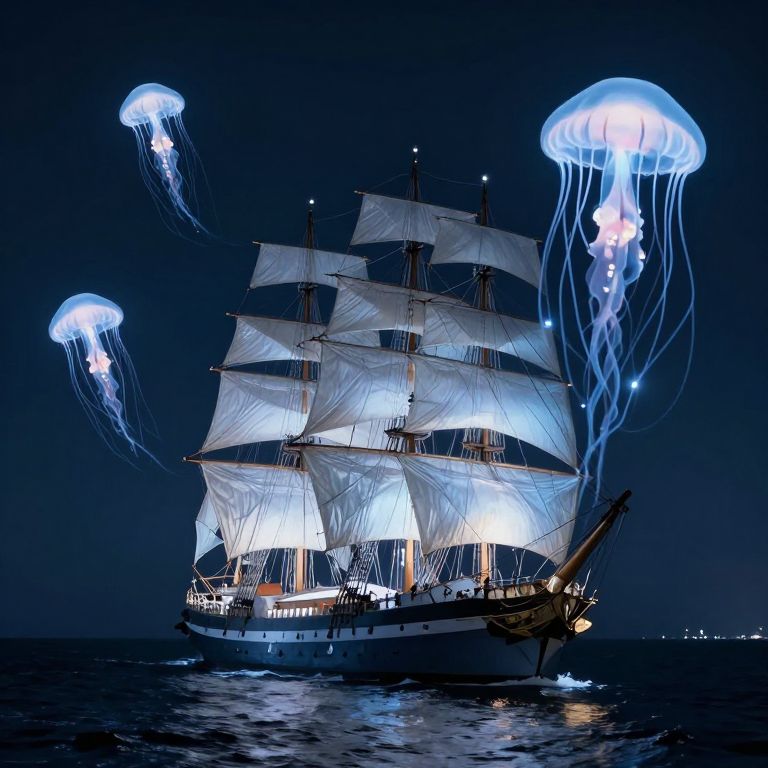A majestic sailing ship glides through the night sea, illuminated by ethereal, translucent jellyfish-like forms that float alongside, their glowing tendrils weaving between the rigging like living, luminous ropes.