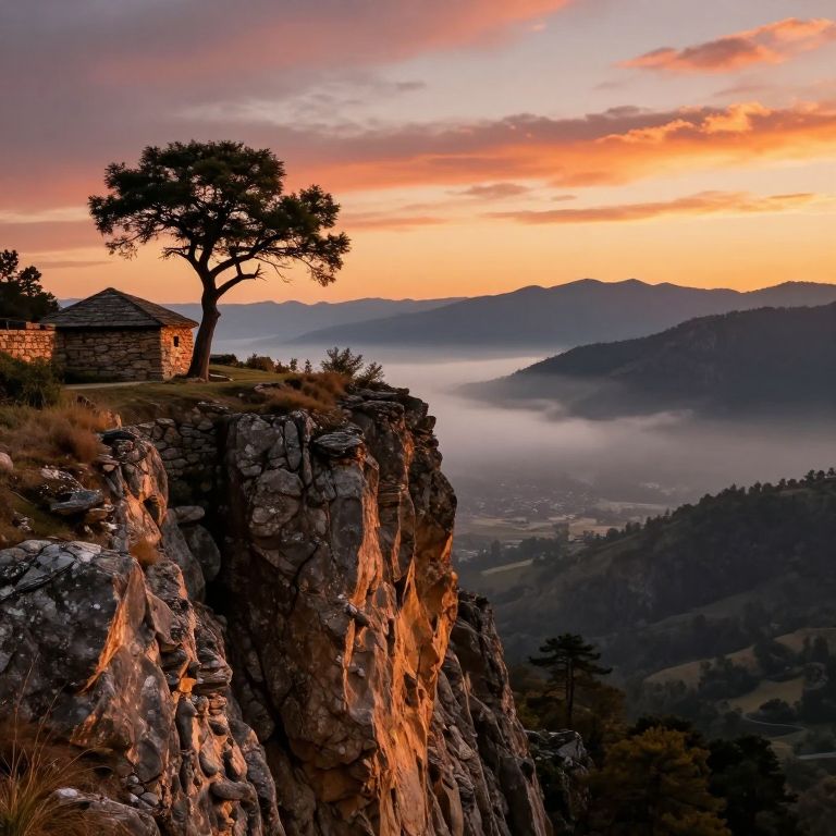 Sunset bathes a rugged cliffside in warm hues, where a solitary tree stands sentinel above a quaint stone structure, overlooking a serene valley blanketed in mist and framed by distant mountains under a vibrant sky.
