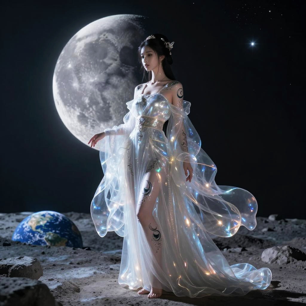 Moon character design portraying an elegant humanoid figure with translucent, shimmering robes that flow like moonlight, delicate lunar motifs tattooed on their skin, and serene expression, standing on a rocky moon surface with Earth visible in the distance.
