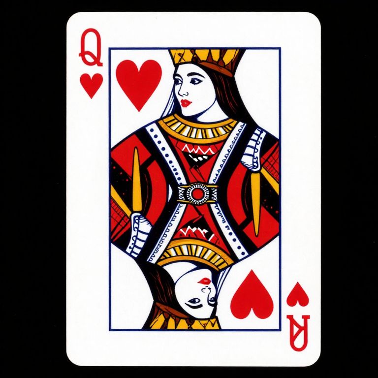 Digital illustration of a Queen of Hearts playing card with bold red, black, and white colors, featuring a crowned, regal figure.