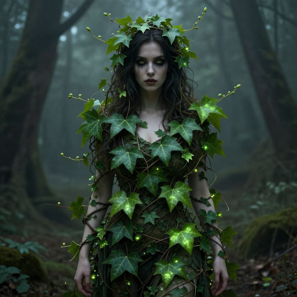 Poison ivy AI art depicting a mysterious woman entwined with lush, vibrant green ivy leaves, glowing with subtle bioluminescence, surrounded by a misty forest background, mystical and ethereal atmosphere, highly detailed digital painting style.