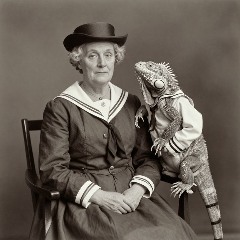 Charlie Bucket 1880 studio portrait of fancy old lady and her big iguana-monkey hybrids in sailor uniforms, aged sepia monochrome, style:late 19th c studio photo,