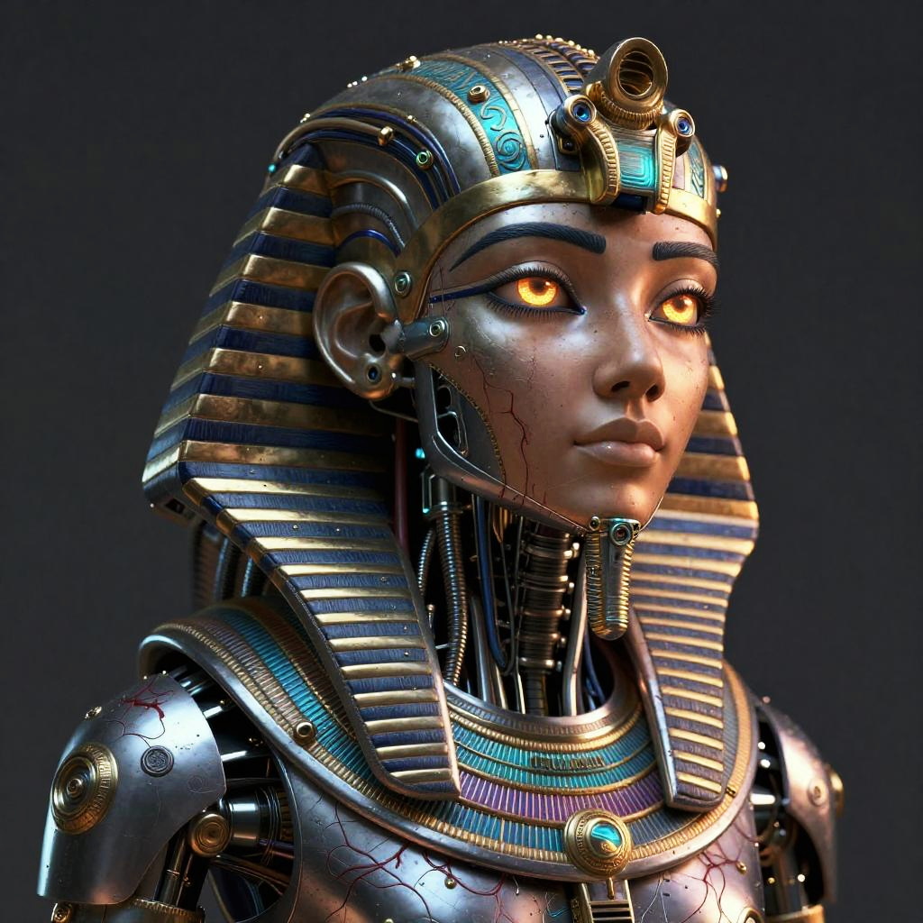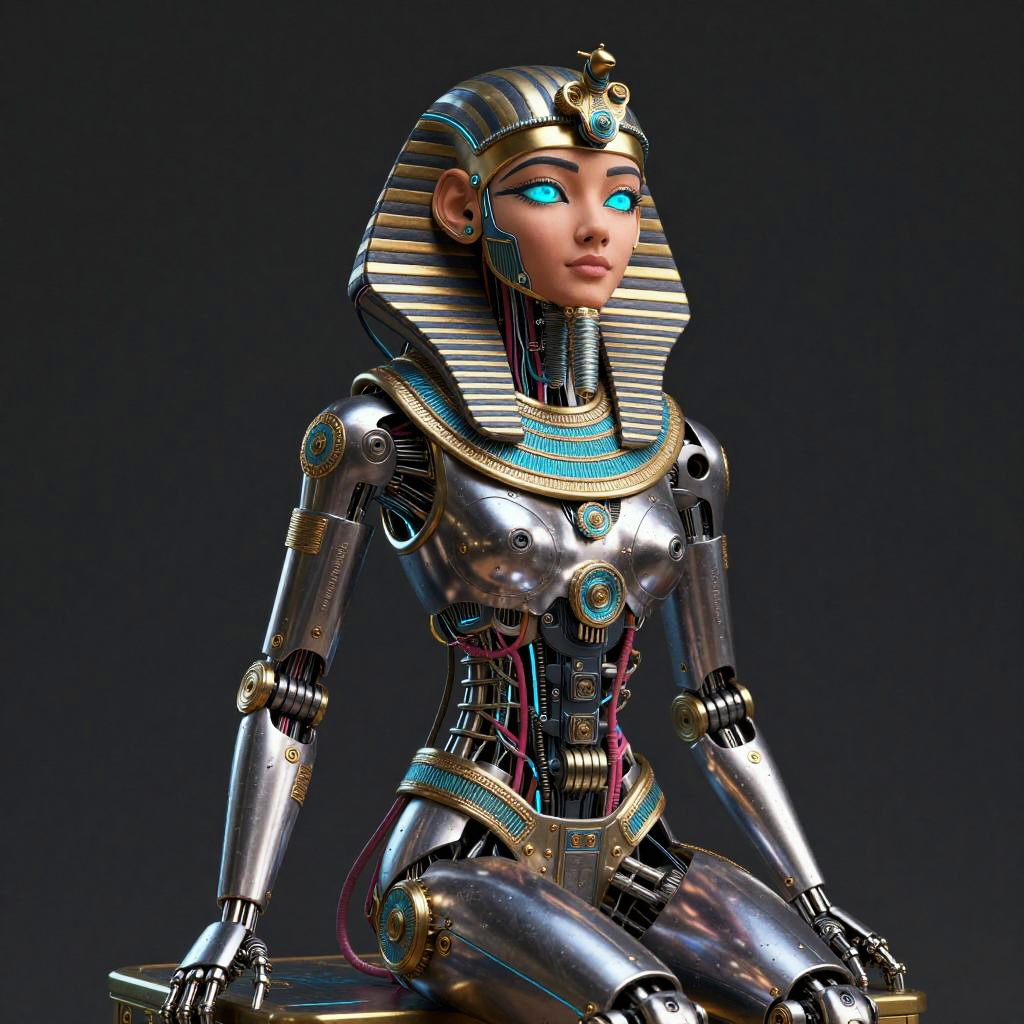 1mechanical girl, ultra realistic details, portrait, global illumination, shadows, octane render, 8k, ultra sharp, intricate, ornaments detailed, cold colors, metal, egypician detail, highly intricate details, realistic light, trending on cgsociety, glowing eyes, facing camera, neon details, machanical limbs, blood vessels connected to tubes, mechanical vertebra attaching to back, mechanical cervial attaching to neck, sitting, wires and cables connecting to head