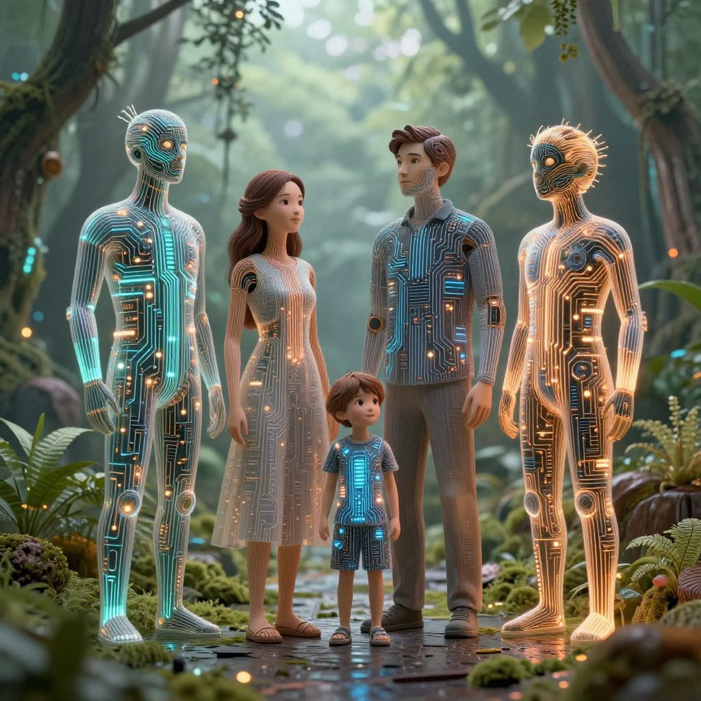 AI family generator producing a surreal family scene where members are composed of intricate circuits and glowing data streams, set in a softly lit futuristic environment that blends technology with organic life, rendered in ultra-realistic style.