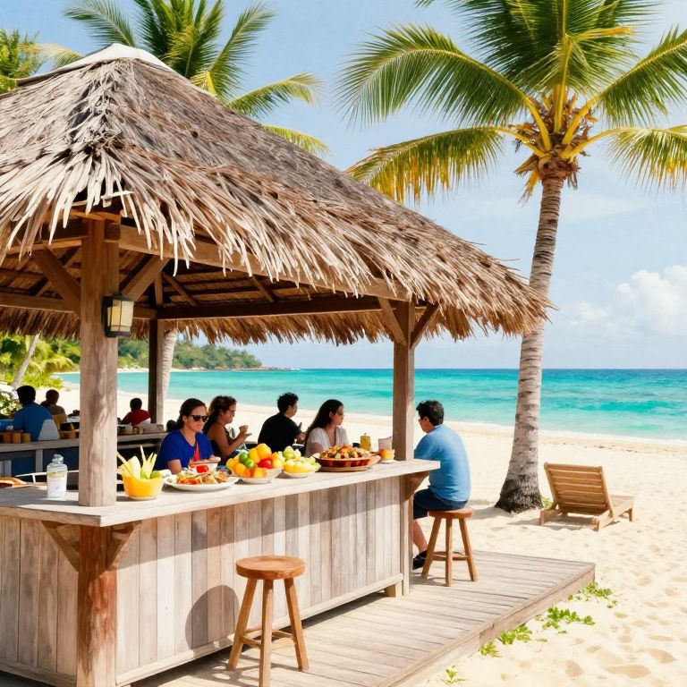 Cafeterias on a tropical beach boardwalk, open-air wooden structures with thatched roofs, bright daylight, patrons enjoying fresh fruit and seafood dishes, palm trees swaying in background, turquoise sea and sandy beach visible, vibrant and relaxed summer vibe, watercolor style.