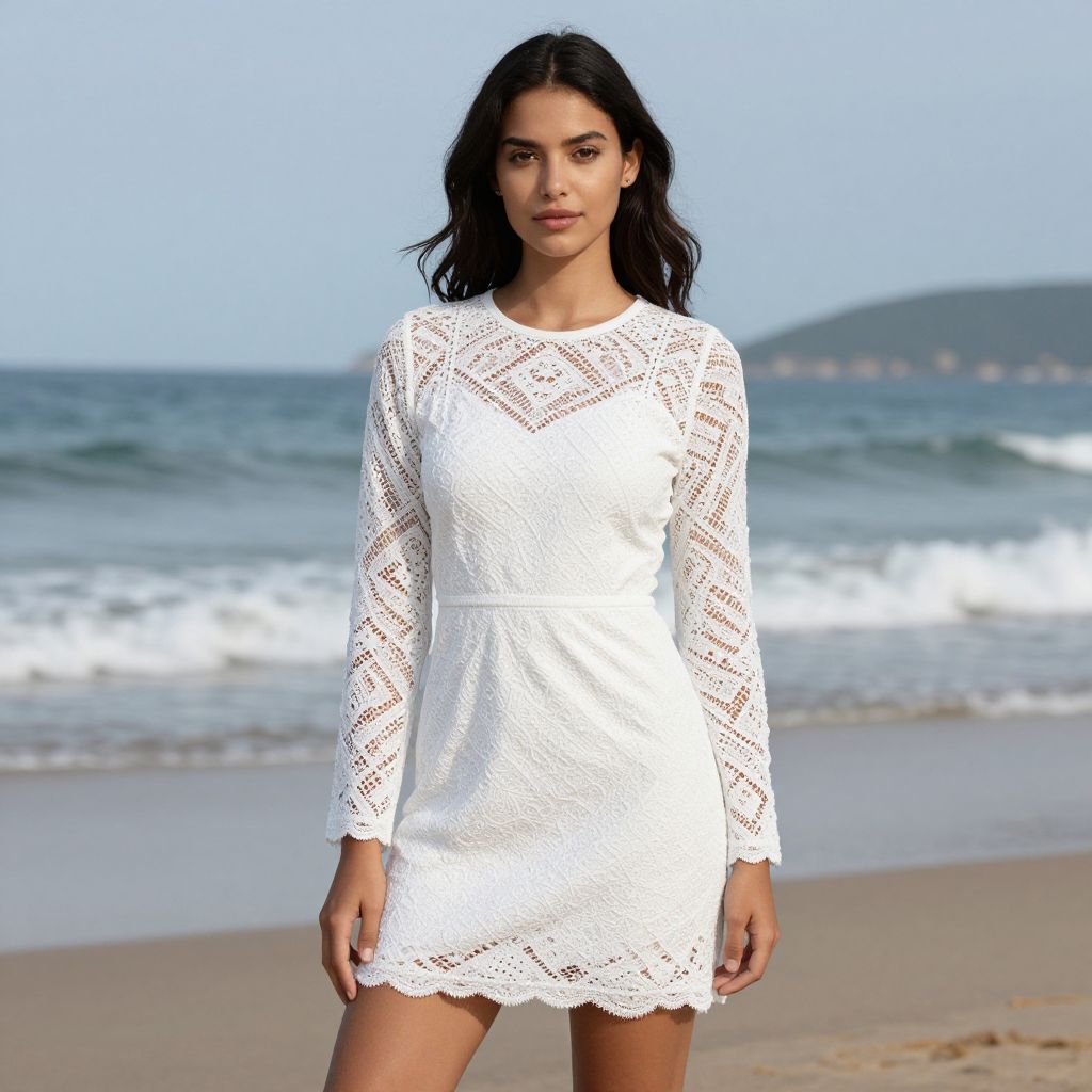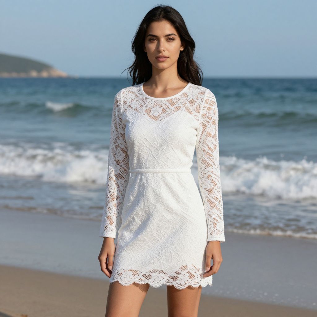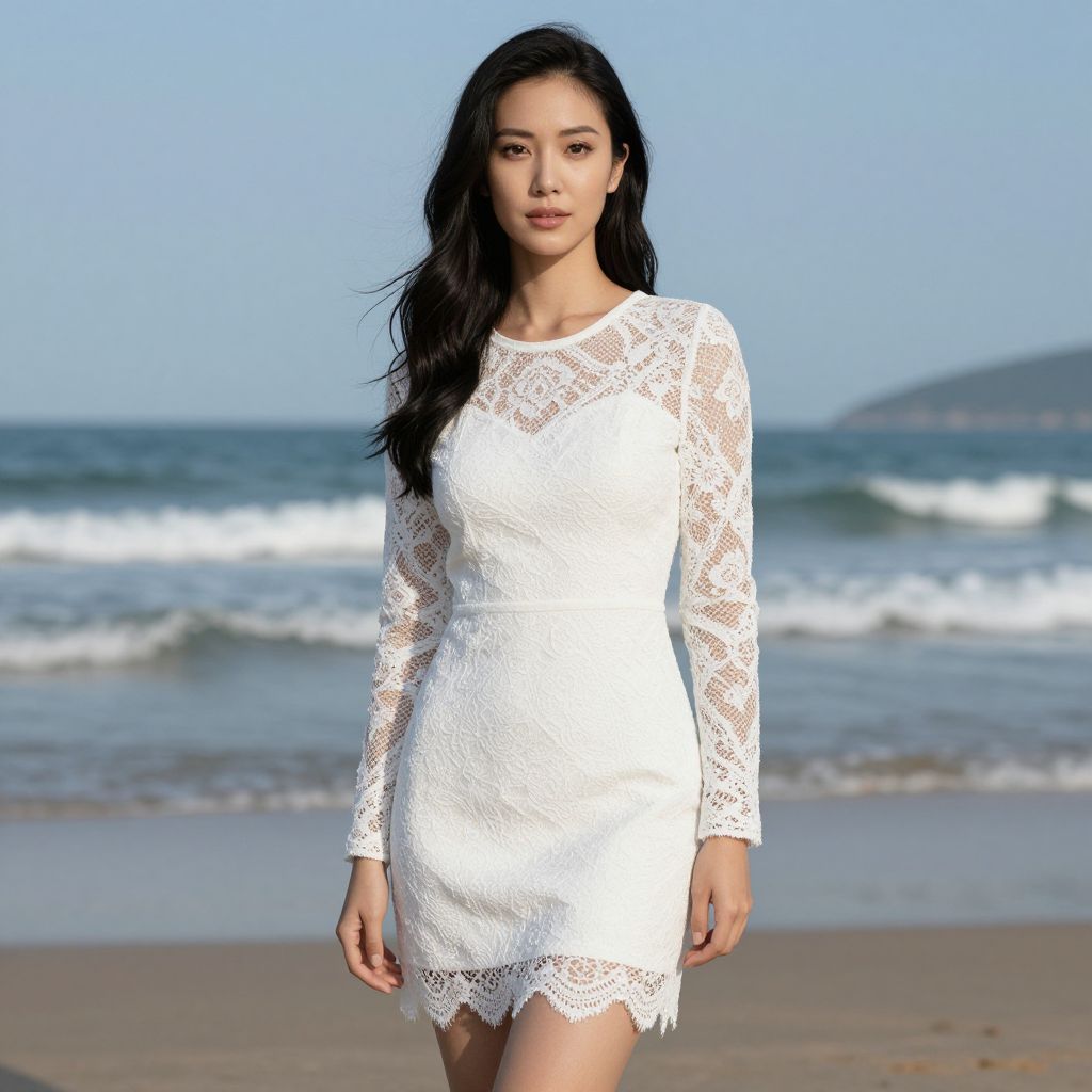 Woman in White Lace Dress by Seashore