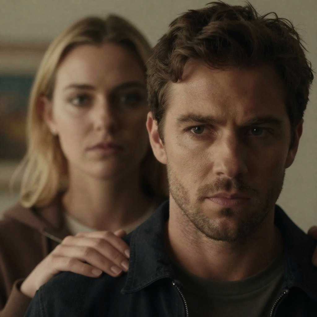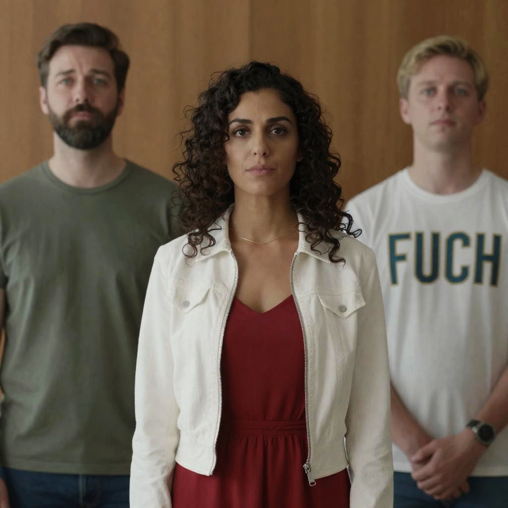 Photograph of three close-up faces: a serious man on the left with short dark hair, a middle-aged man with a stubbly chin in the center, and a concerned woman on the right with dark hair. Warm orange and red lighting, ured background.