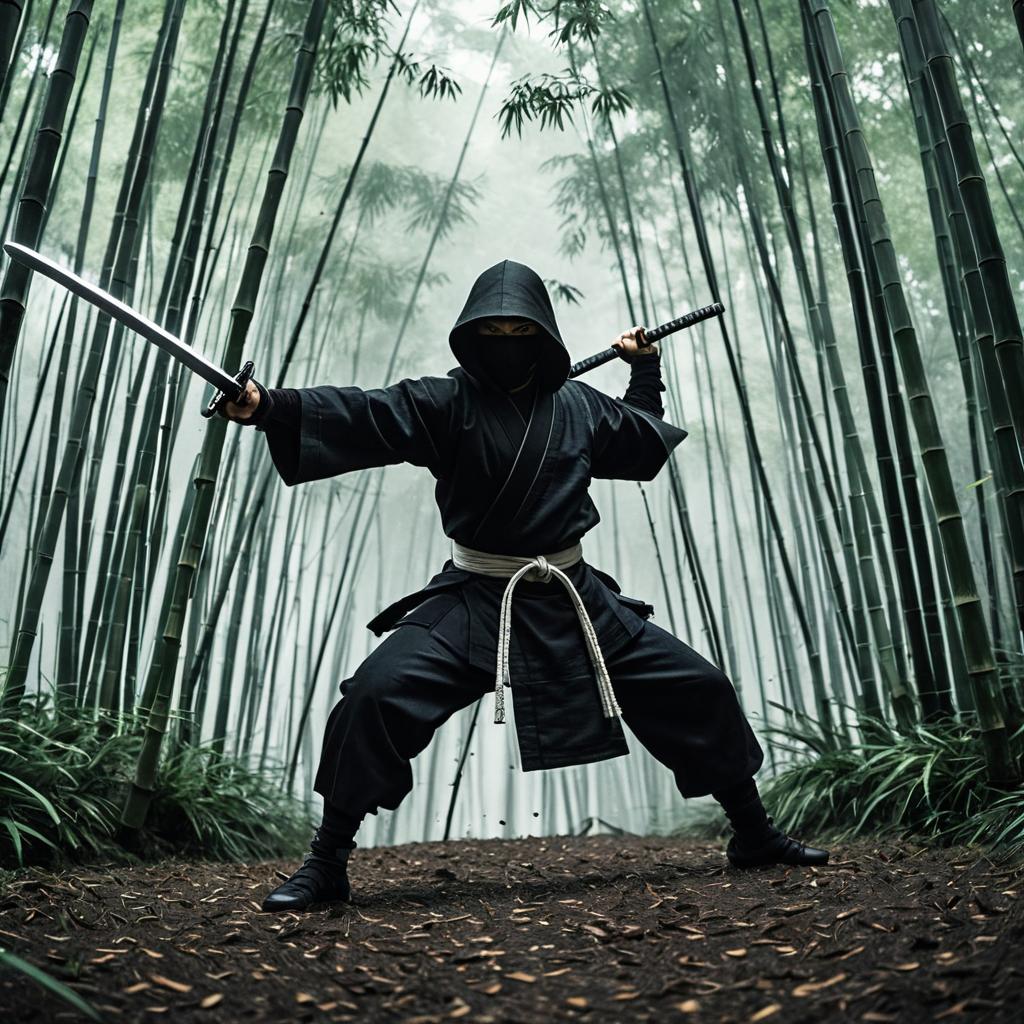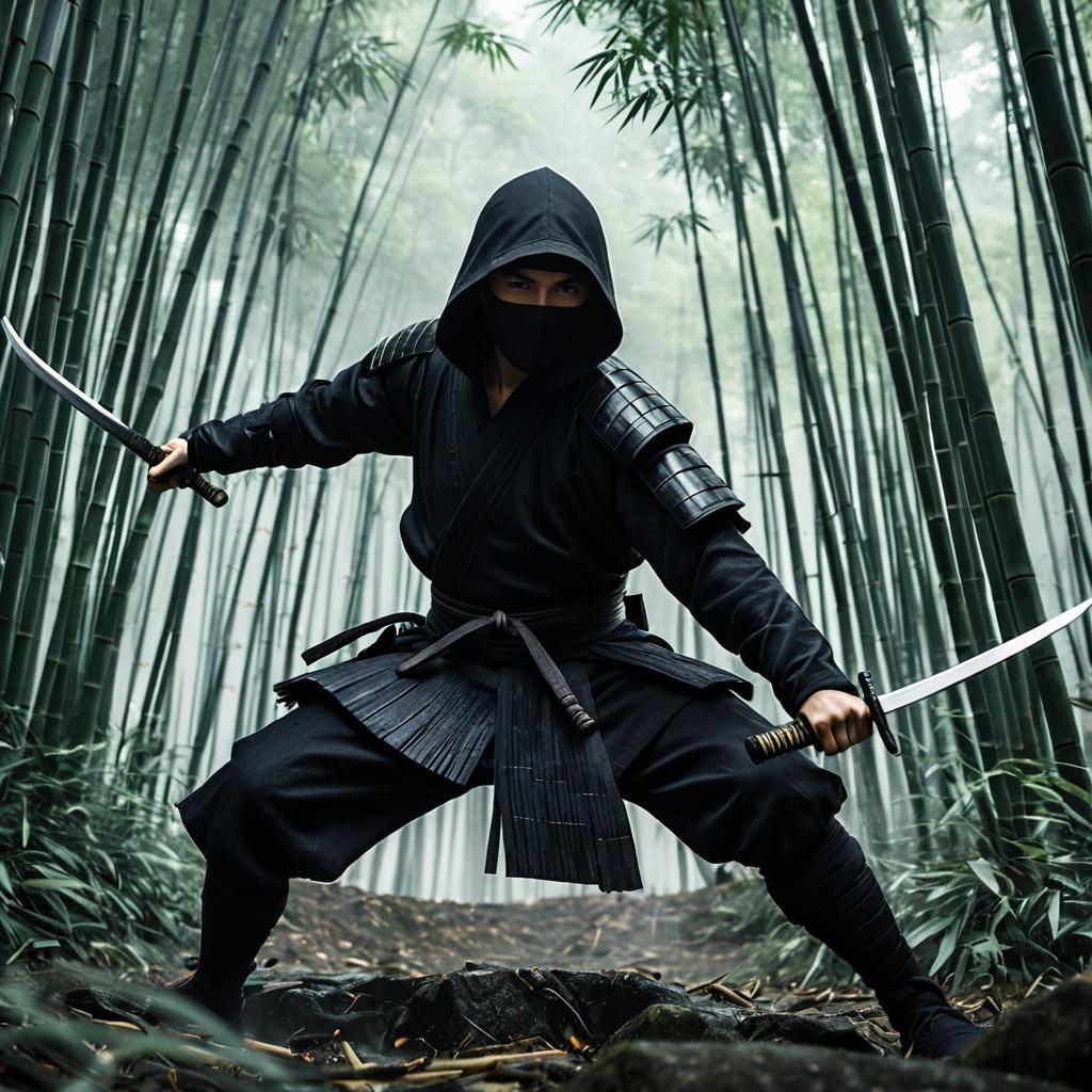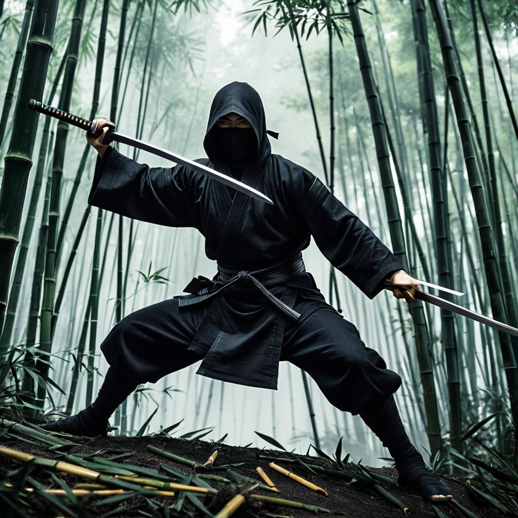 An agile ninja dressed in sleek black shinobi attire wielding dual katanas in a dynamic fighting stance. The warrior is positioned in a misty bamboo forest, surrounded by tall bamboo stalks, evoking an intense and mysterious atmosphere.