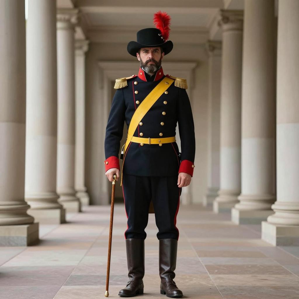 Mauled ringmaster costume, photograph of elderly man, wearing ornate red and gold royal military uniform, large red hat with white fur trim, intricate gold embroidery, white ruffled neck piece, stern expression, stone wall background, realistic detail, historical clothing, regal, portraiture style, medium close-up, bright colors, ured fabric, elaborate design, portrait photography, traditional fashion, realistic lighting