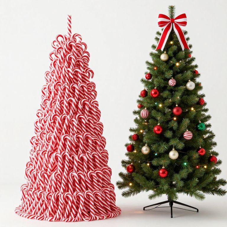 Candy Cane Christmas Tree showcases two festive designs: one crafted entirely from red and white striped candy canes forming a dense, textured tree, while the other is a traditional green pine tree adorned with colorful ornaments, lights, and a red-and-white ribbon bow at its top.