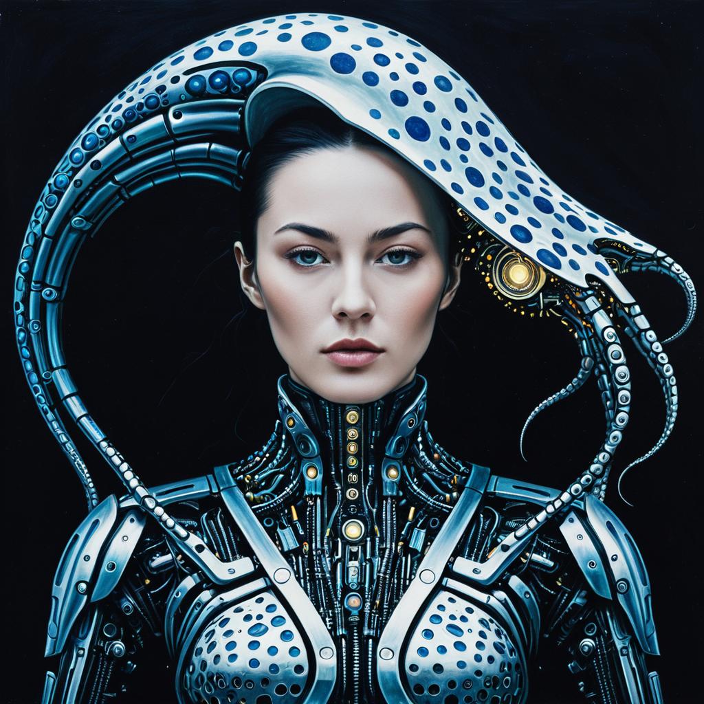 Digital painting of a robotic cephalopod alien featuring a blend of human and mechanical elements. The portrait showcases a non-binary futuristic figure with bioluminescent blue circuits, fluid metallic skin, and intricate mechanical tentacles extending from the head. The design embodies cybernetic beauty and advanced technology with influences from avant-garde artists.