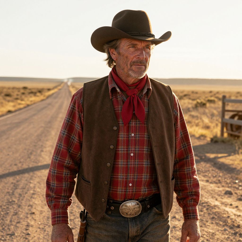 A rugged man with a strong, weathered face and gray-streaked brown hair stands in a sunlit western landscape, wearing a brown vest over a red plaid shirt, a red scarf neatly wrapped around his neck, and a classic brown cowboy hat perched on his head. He wears a black belt with a silver buckle, adding a touch of timeless charm. The setting features a dusty road with a distant horizon, golden sunlight casting long shadows, and the atmosphere is warm and inviting, evoking a sense of old-time Americana and quiet determination.