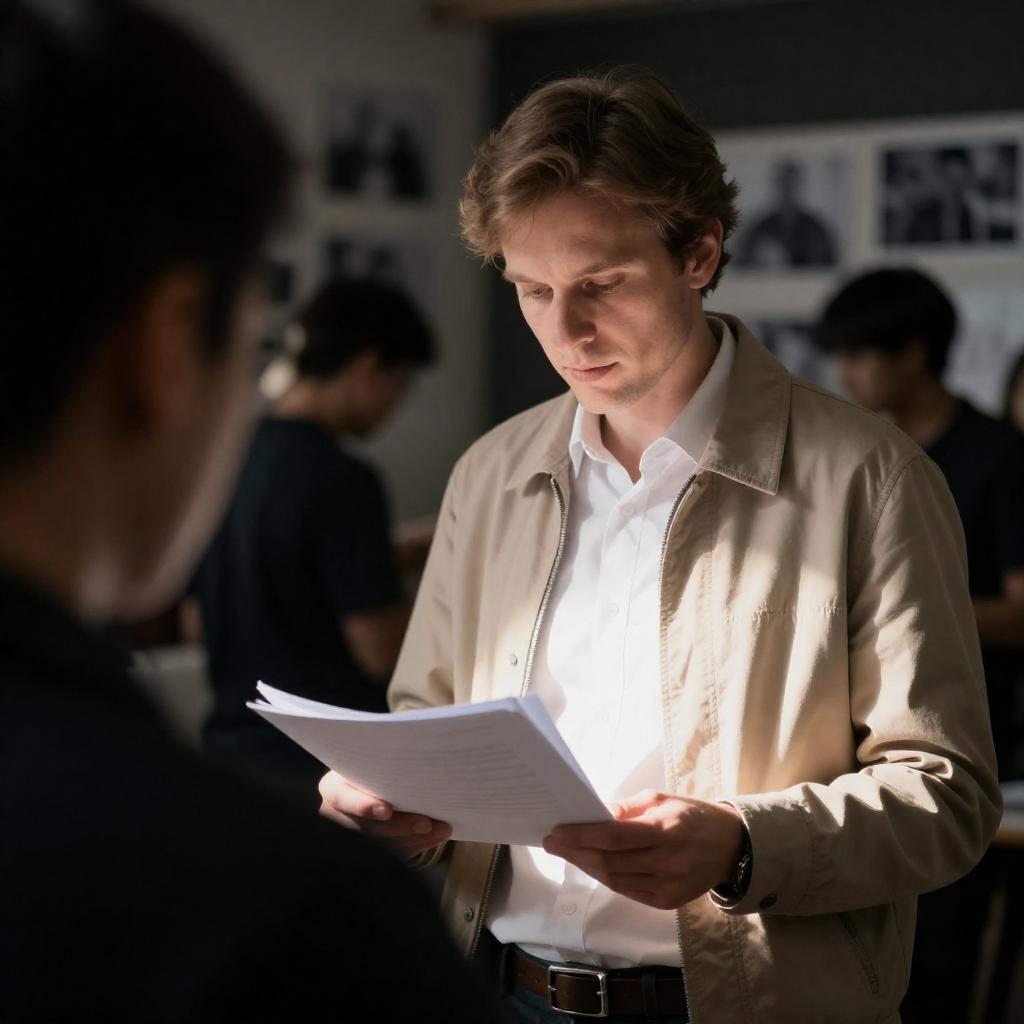 Young man with light brown hair wearing a beige jacket over a white shirt, intently reading papers. The scene is illuminated by focused, bright light creating strong contrast with the darker, blurred background featuring black and white photos on the wall. Additional blurred figures are present, suggesting a group setting.